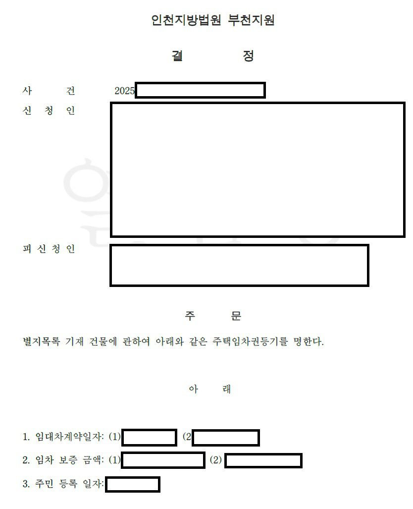 [This document is a formal Housing Leasehold Registration Order issued by the Bucheon Branch of the Incheon District Court in 2025. The court has officially ordered the registration of a leasehold for the building specified in the attached list to legally protect the tenant’s interests. The order explicitly records essential details of the tenancy, including the lease agreement date, the total lease deposit amount, and the tenant’s resident registration date. In the Korean legal system, this order is a crucial mechanism that allows a tenant to maintain their “opposing power” (legal seniority) and “priority repayment rights” over their security deposit, even after they physically move out of the property.]
